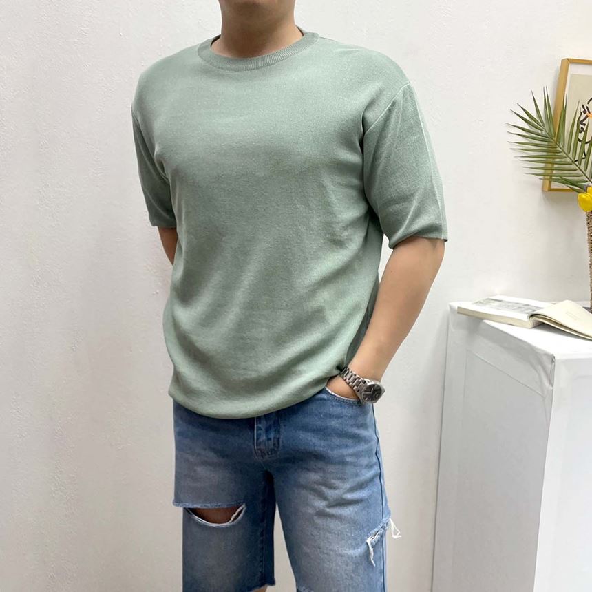 남녀공용 시원한 린넨 라운드 반팔 니트