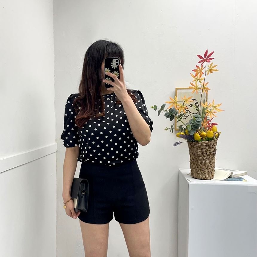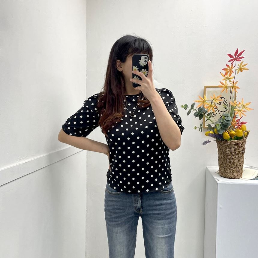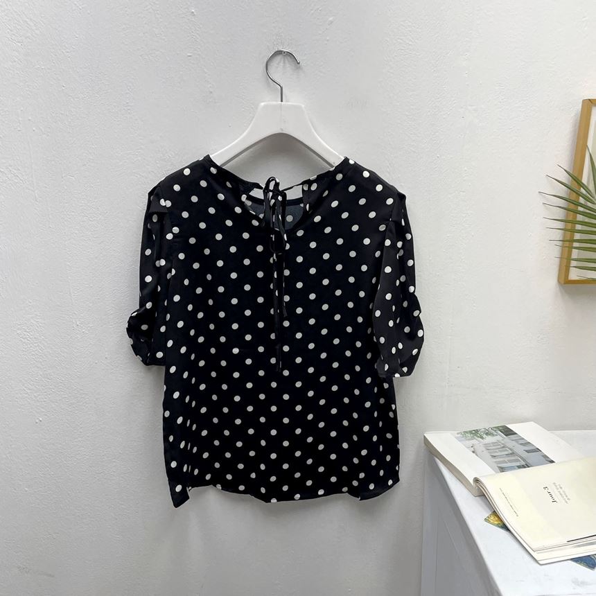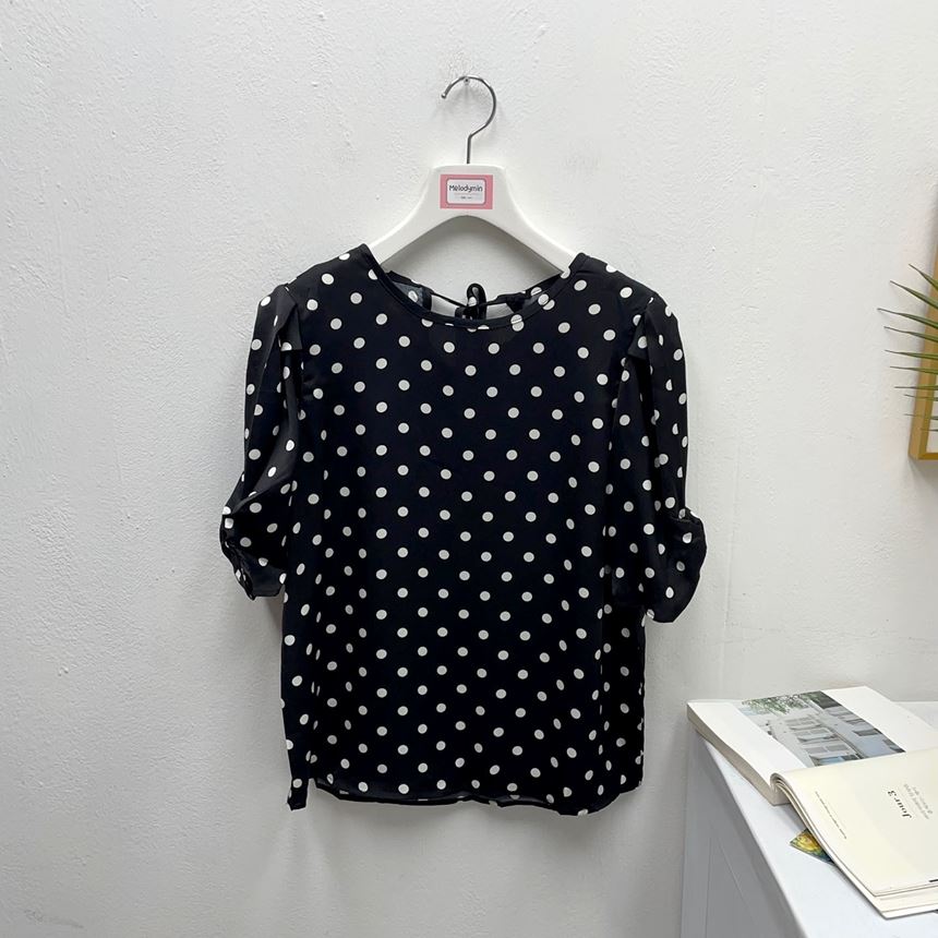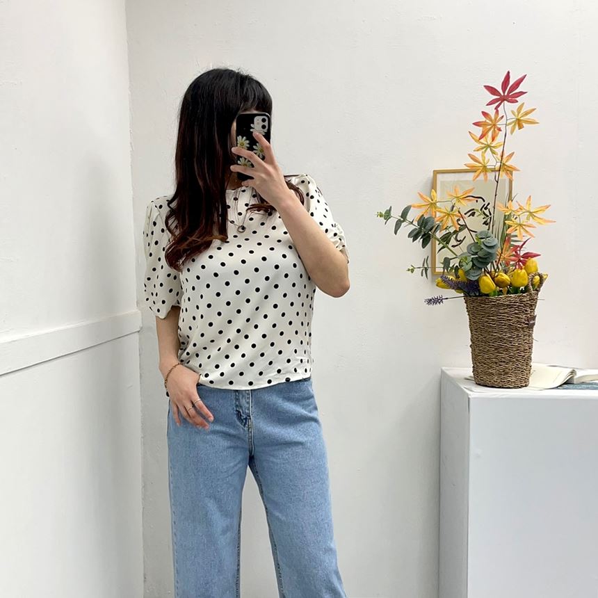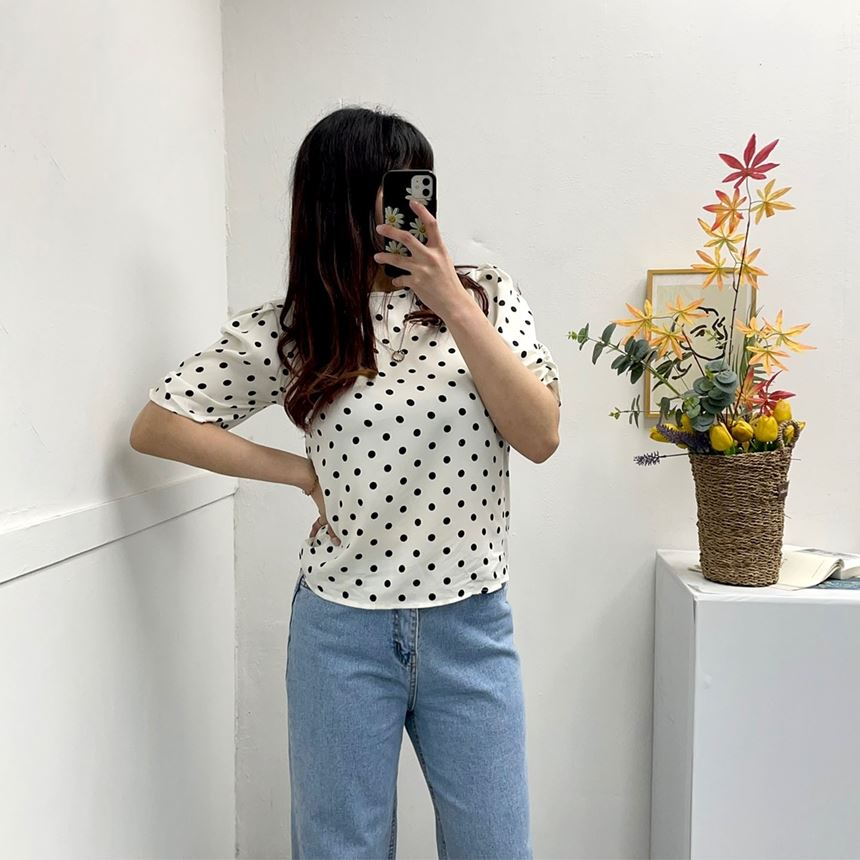 • 퍼프 셔링 땡땡이 반팔 블라우스
