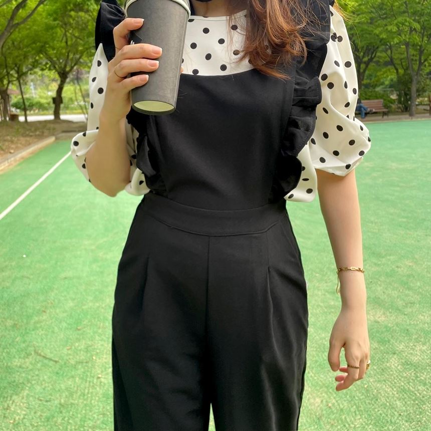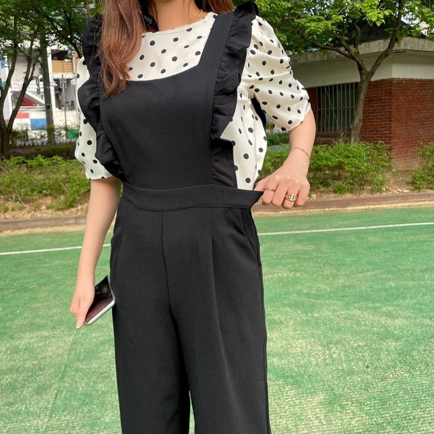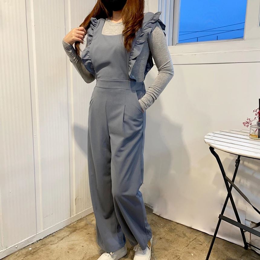 스퀘어넥 프릴 멜빵 밴딩 점프슈트
