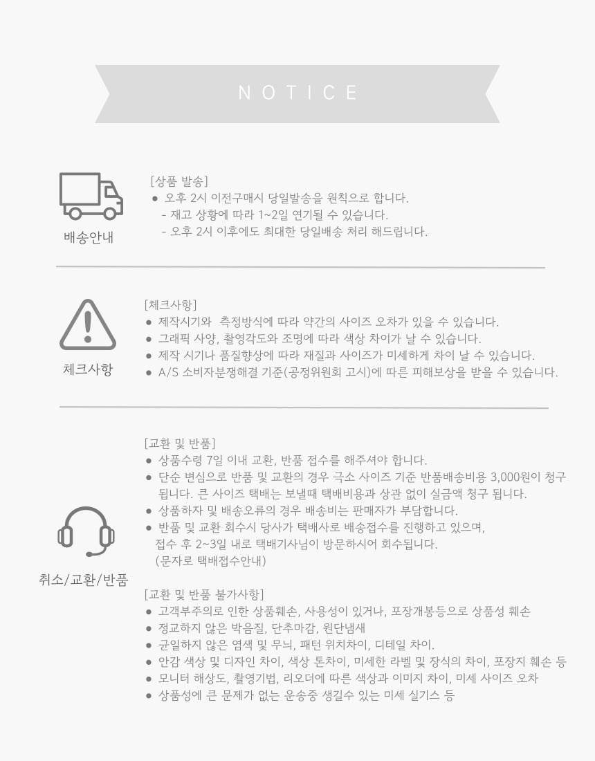 ㆍ 상품 수령일로부터 7일 이내 반품, 교환 가능합니다. ㆍ 단순변심 및 고객님의 사정으로 반품, 교환 하실 경우, 반송비(교환의 경우 왕복배송비)는 고객님 부담입니다. ㆍ 상품의 내용이 표시·광고의 내용과 다른 경우에는 상품을 수령한 날부터 3개월 이내, 그 사실을 안 날 또는 알 수 있었던 날부터 30일 이내에 청약철회 가능합니다.