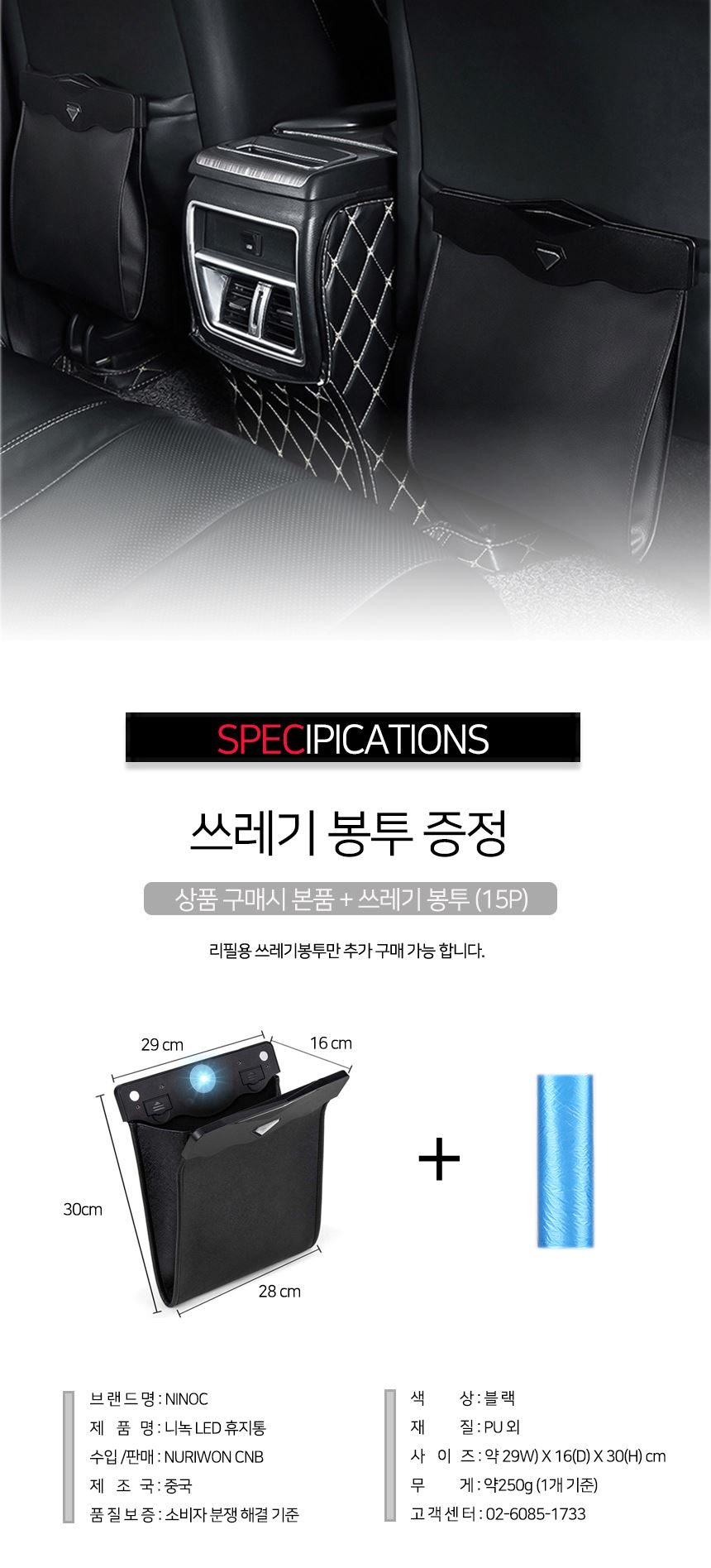 • 니녹 차량용 LED 쓰레기통 쓰레기봉투 뒷좌석용 휴지통 일체형 [휴지통+비닐봉투]