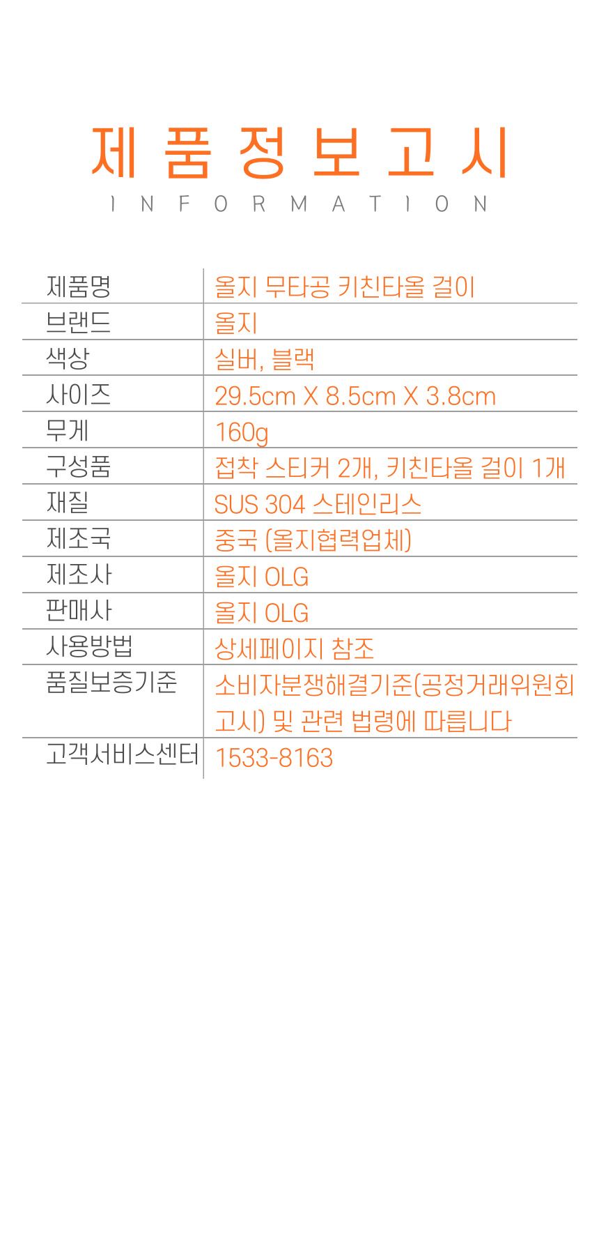 품명 및 모델명 올지 무타공 키친타올걸이 OLGL017