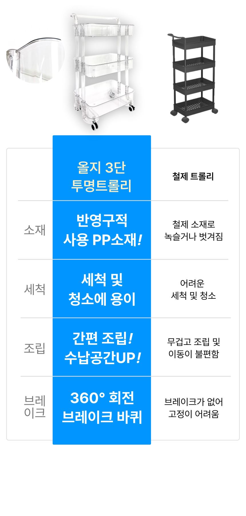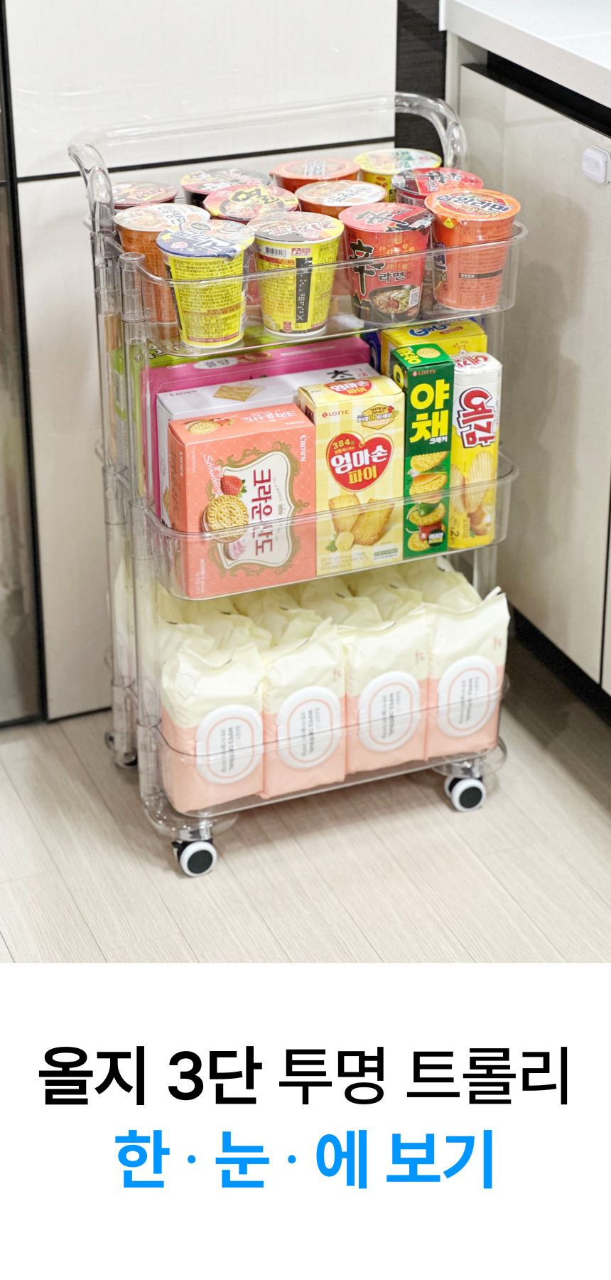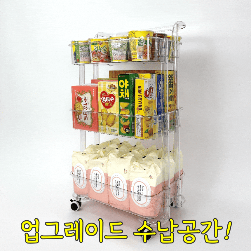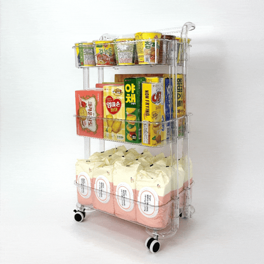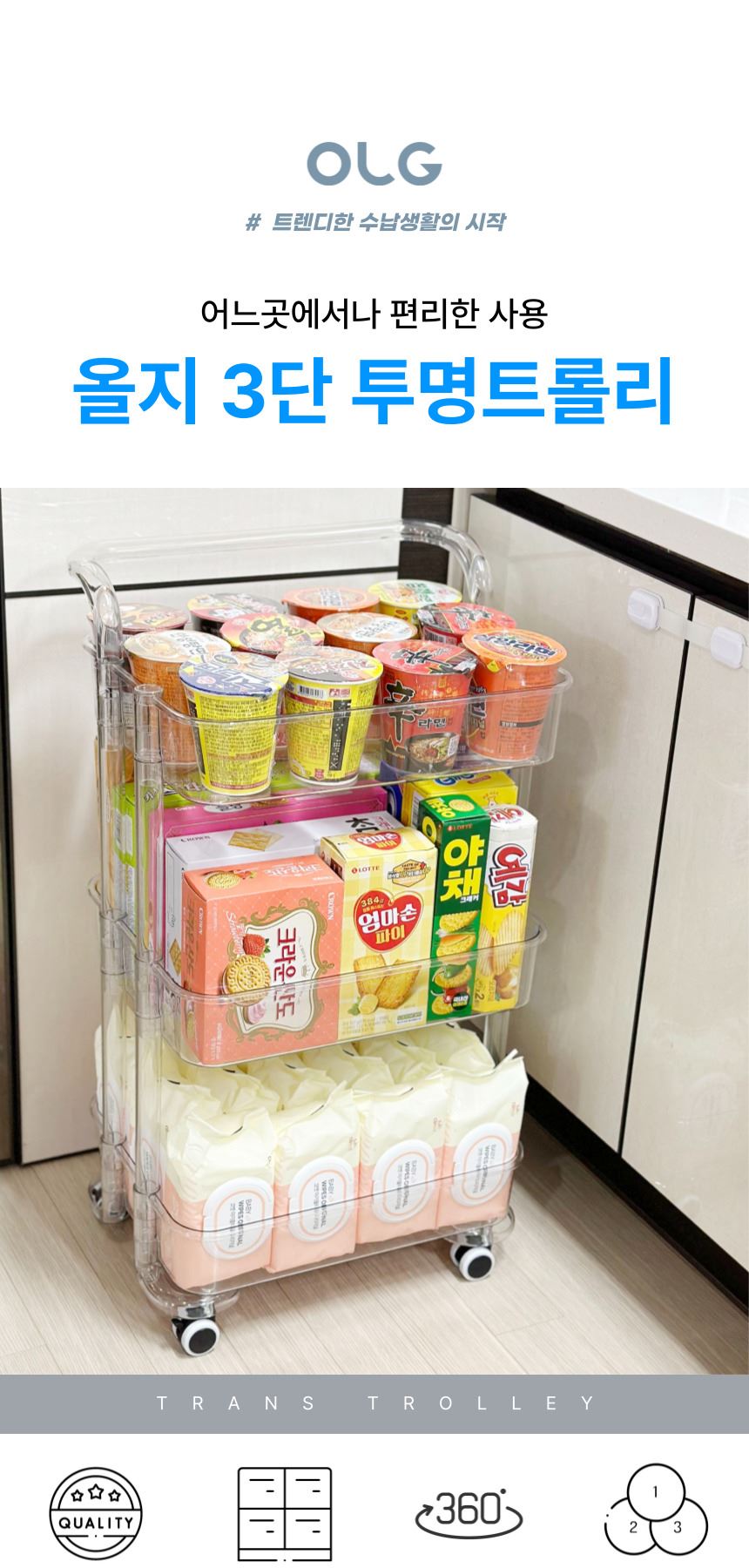 • 올지 투명 트롤리 수납함 3단 주방 360도 회전 핸들 카트 모던 미드센츄리