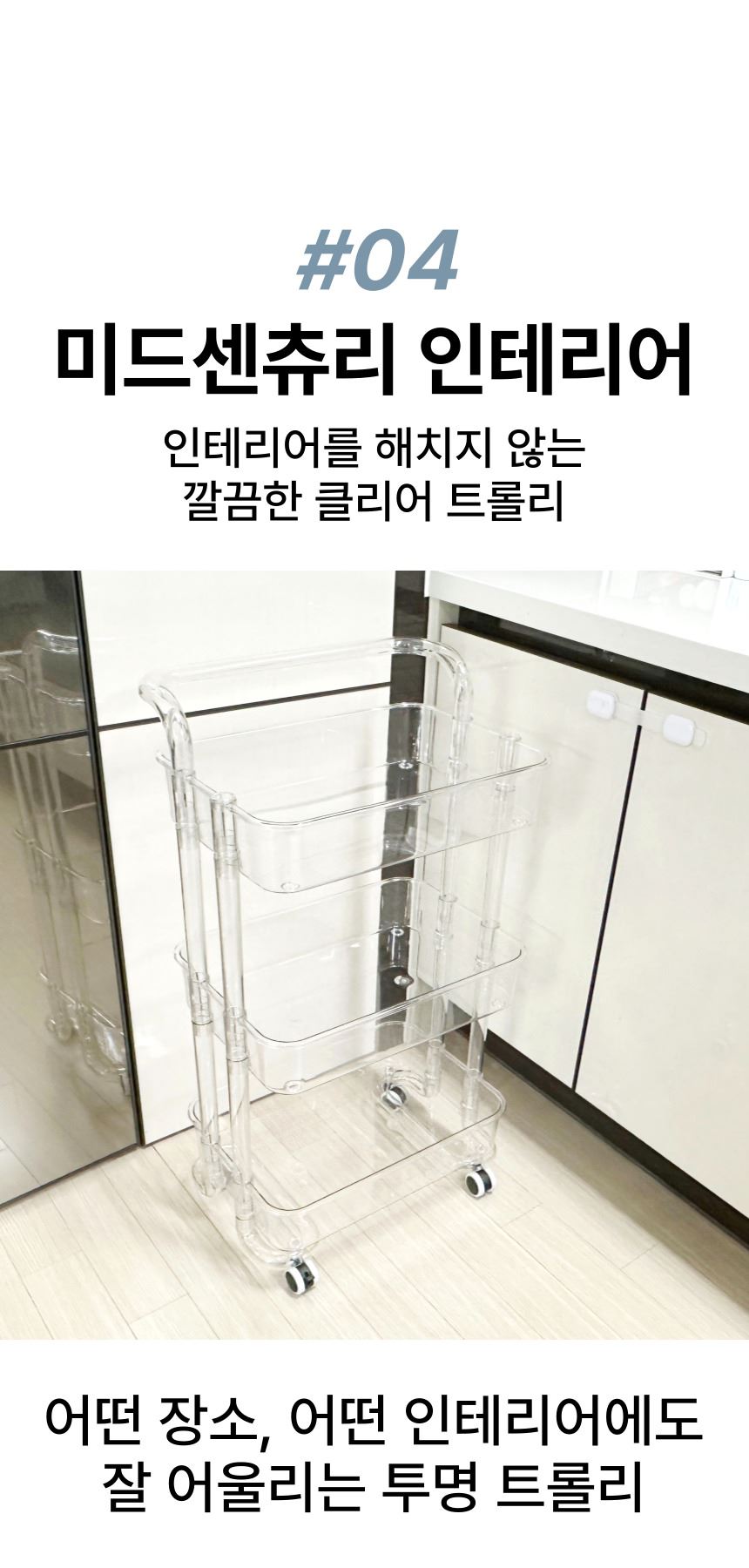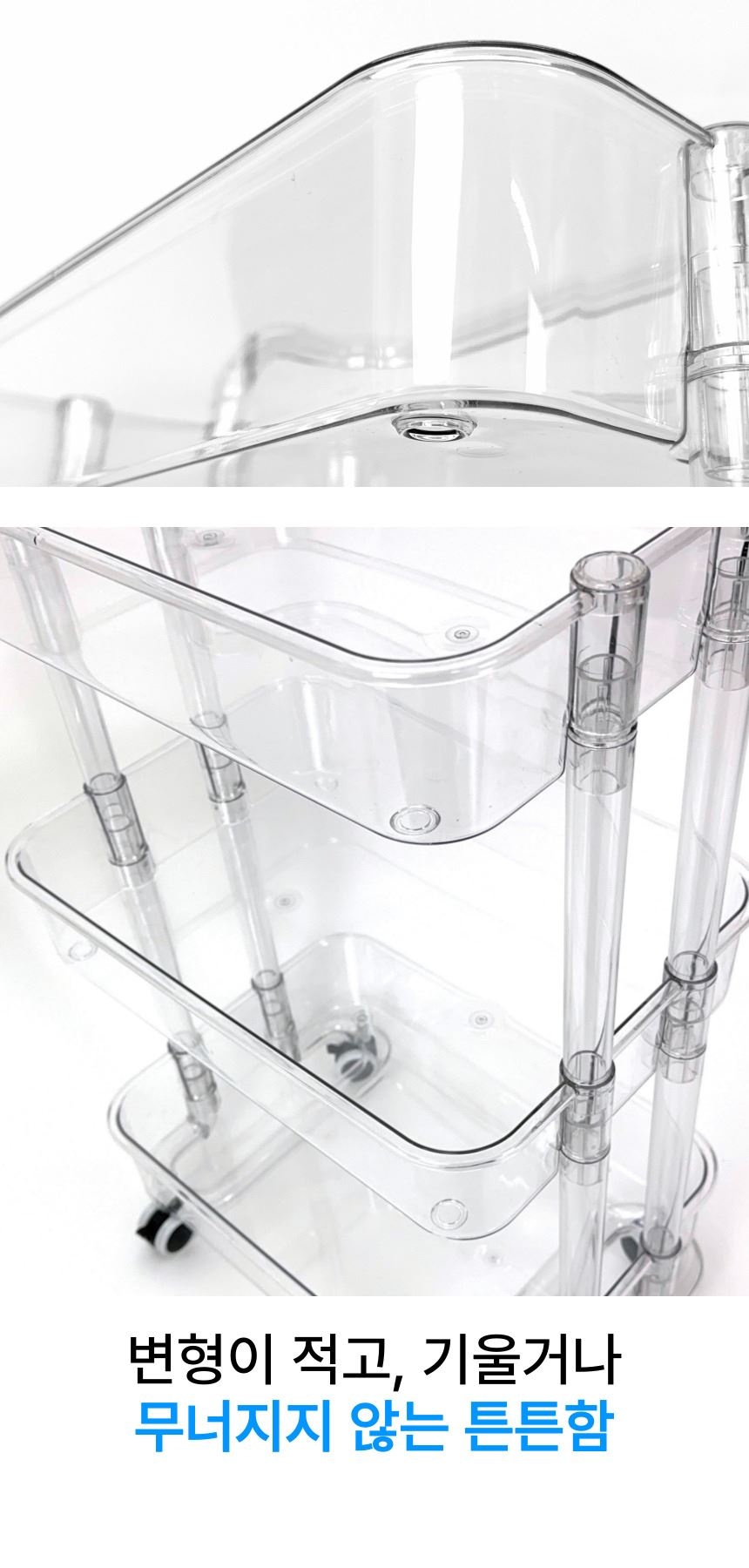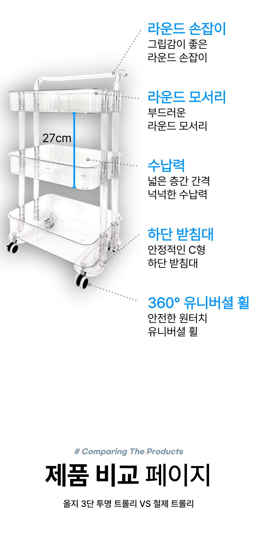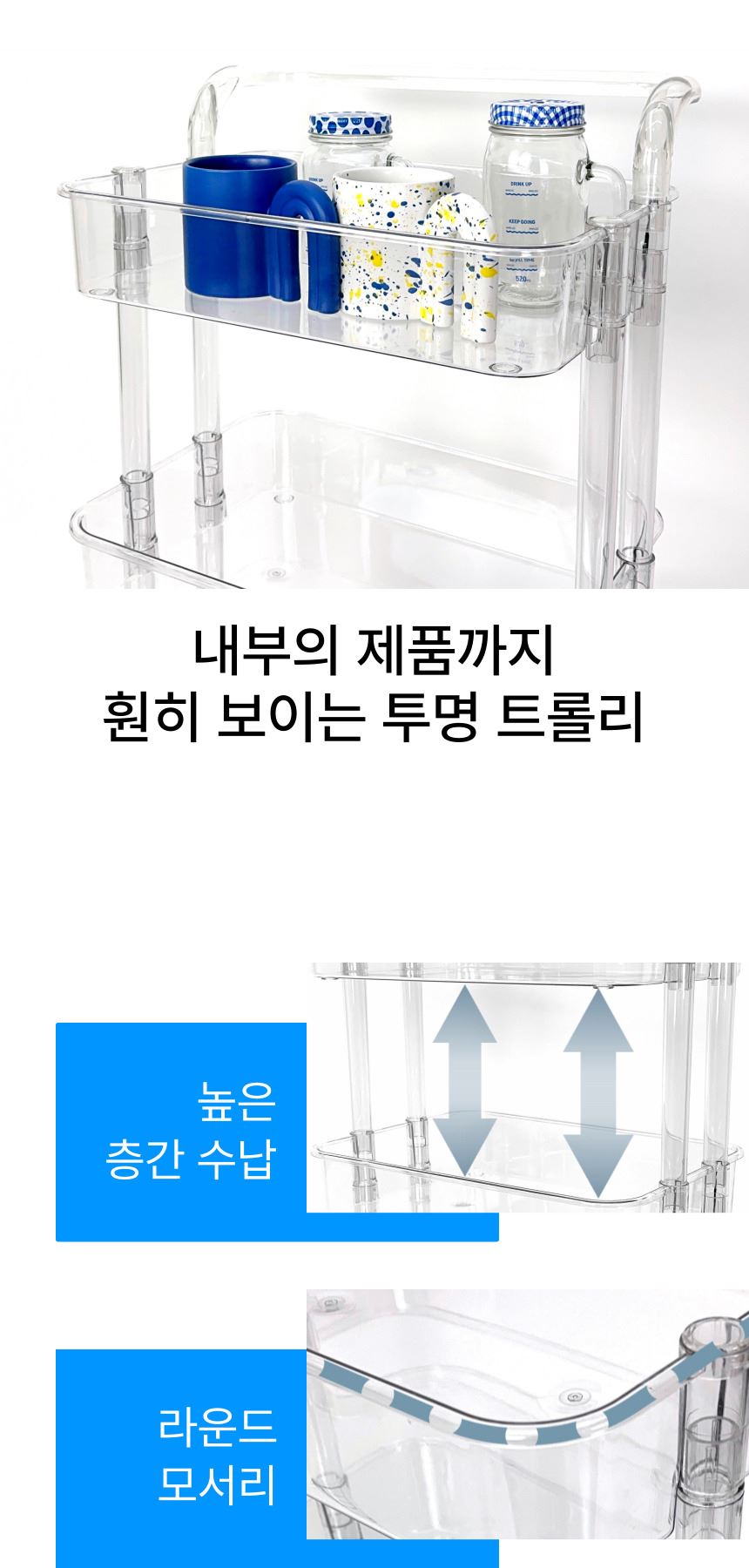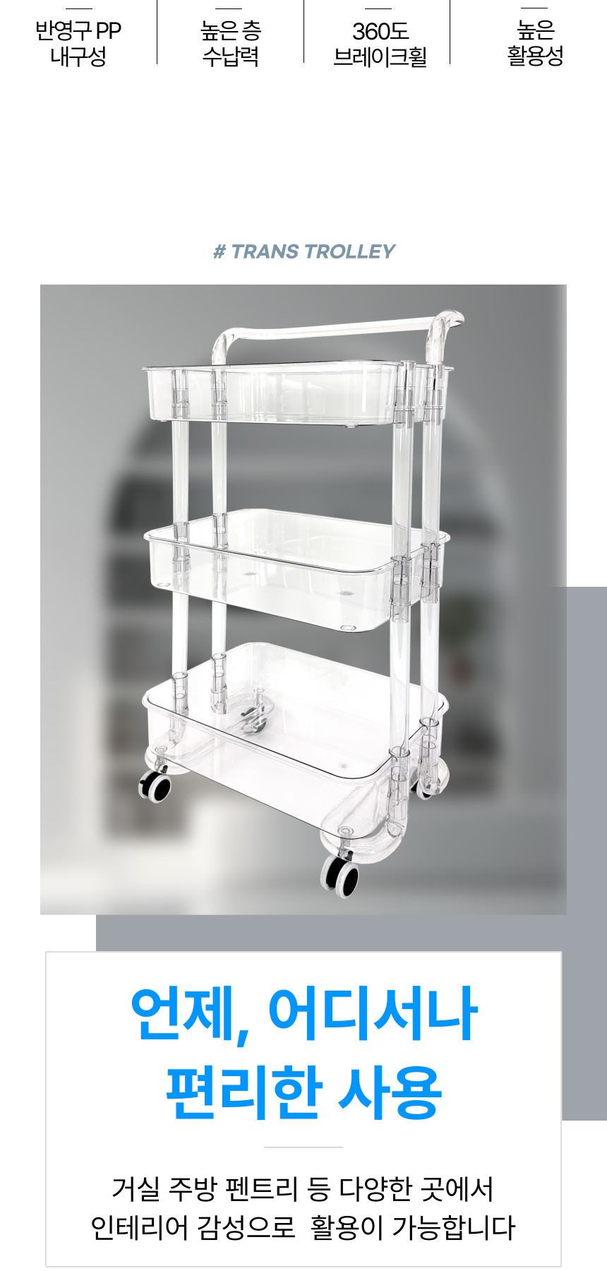• 올지 투명 트롤리 수납함 3단 주방 360도 회전 핸들 카트 모던 미드센츄리