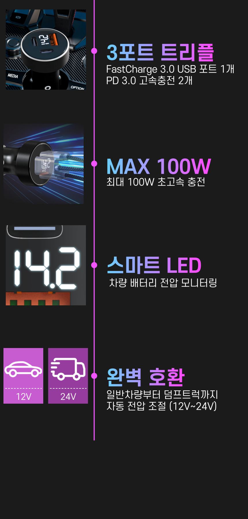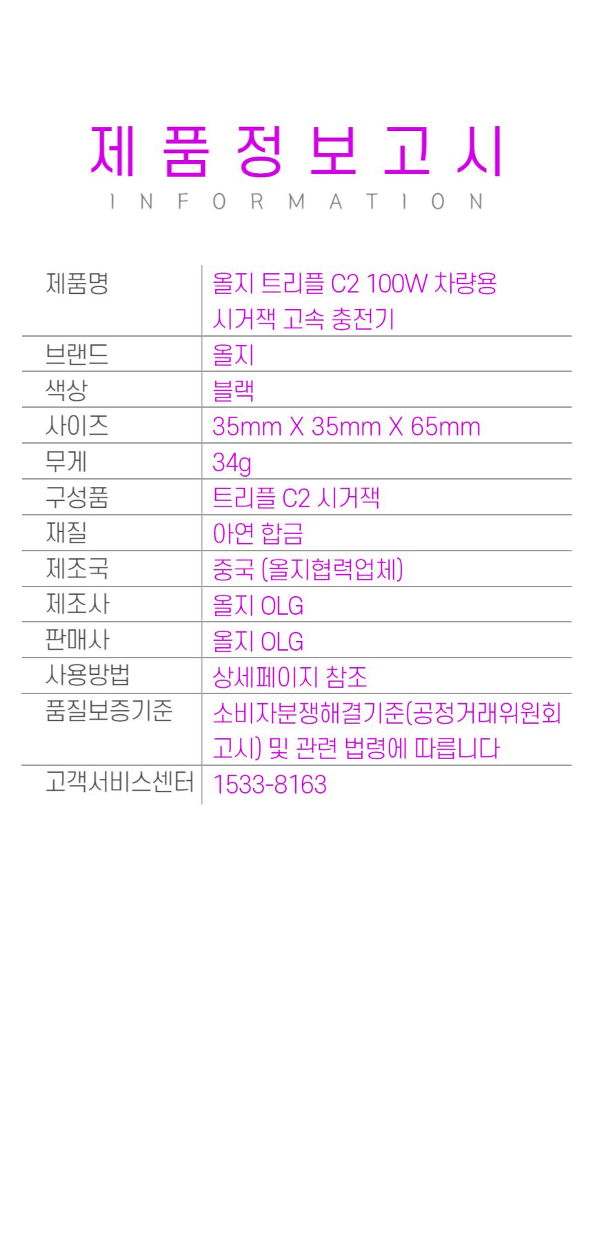 • 올지 트리플 시거잭 C2 100W 차량용 고속 충전기 3구 시가잭 usb
