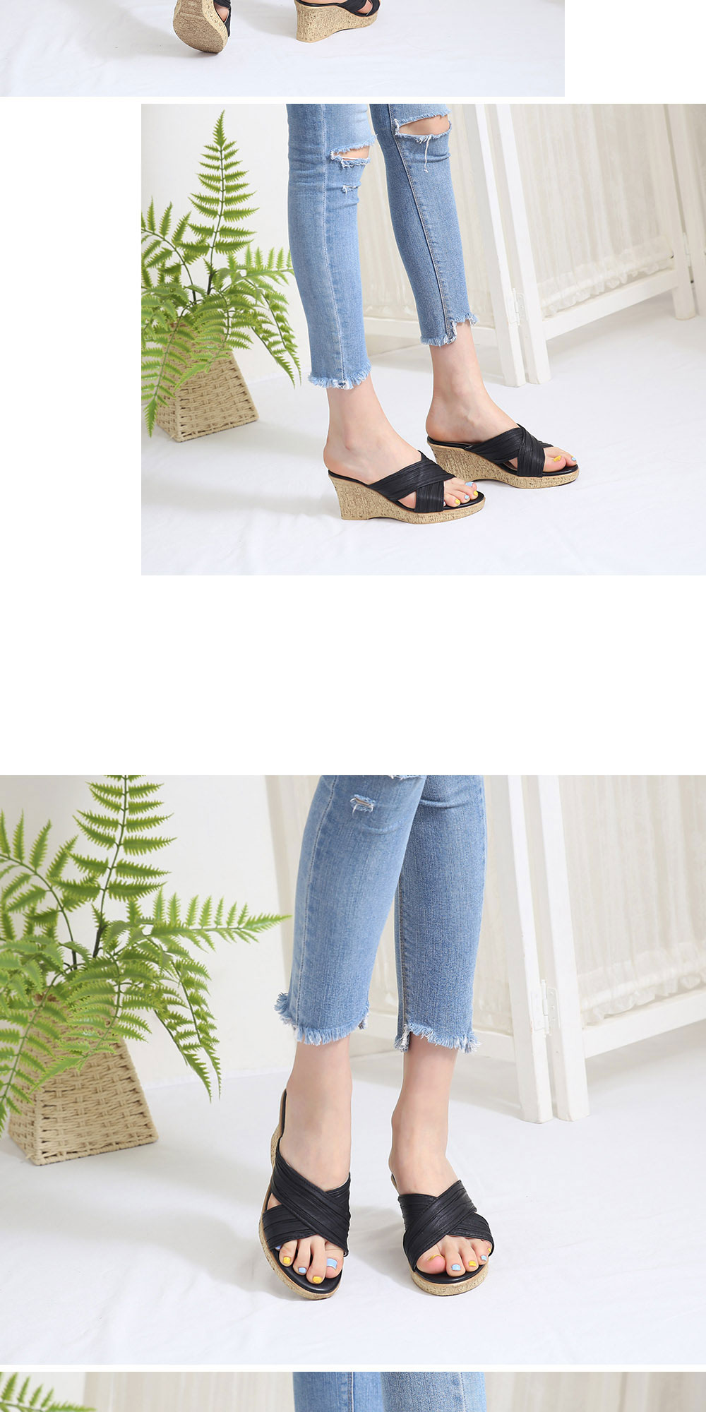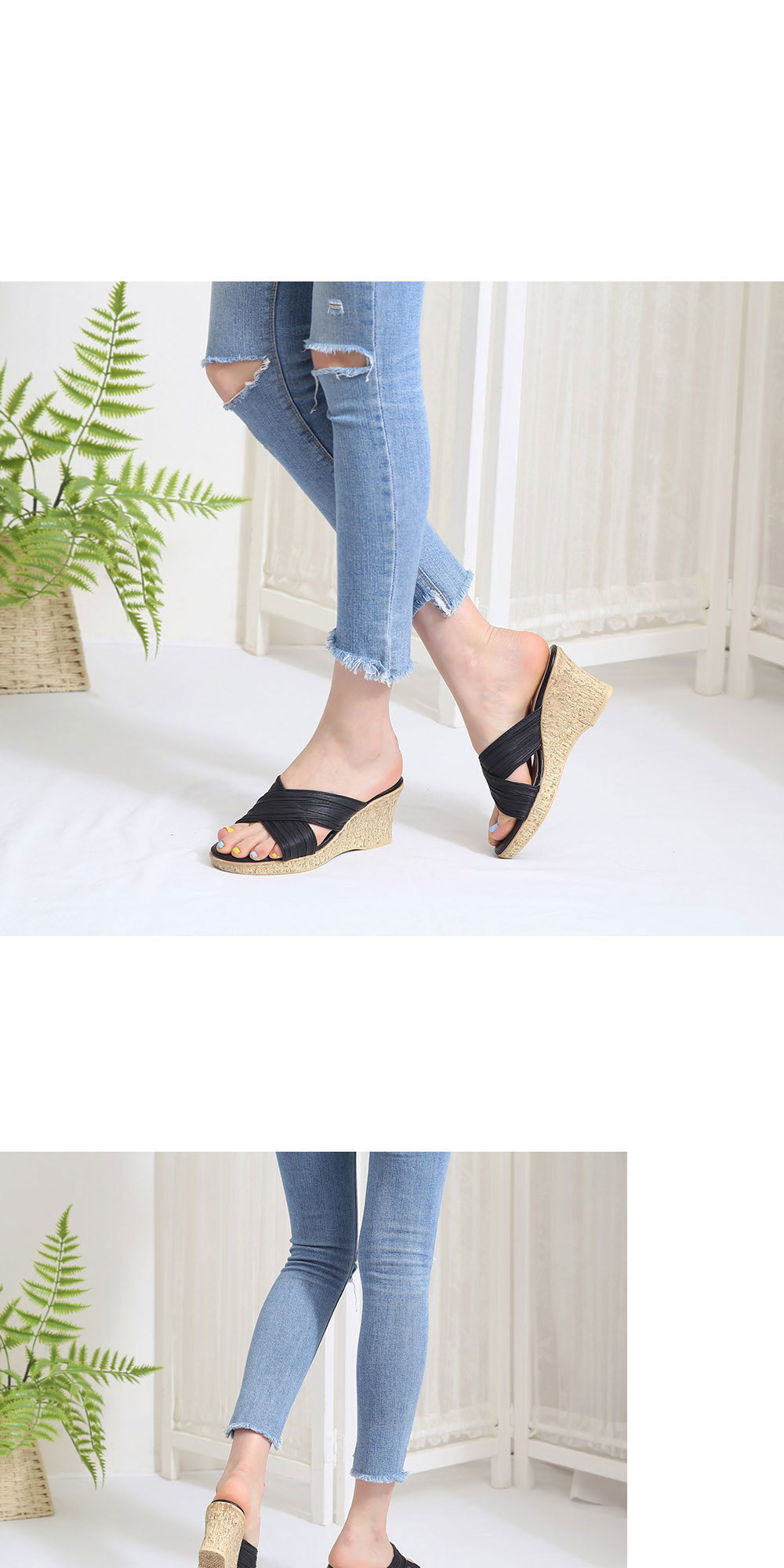 • 주름 크로스 웨지 통굽 키높이 슬리퍼