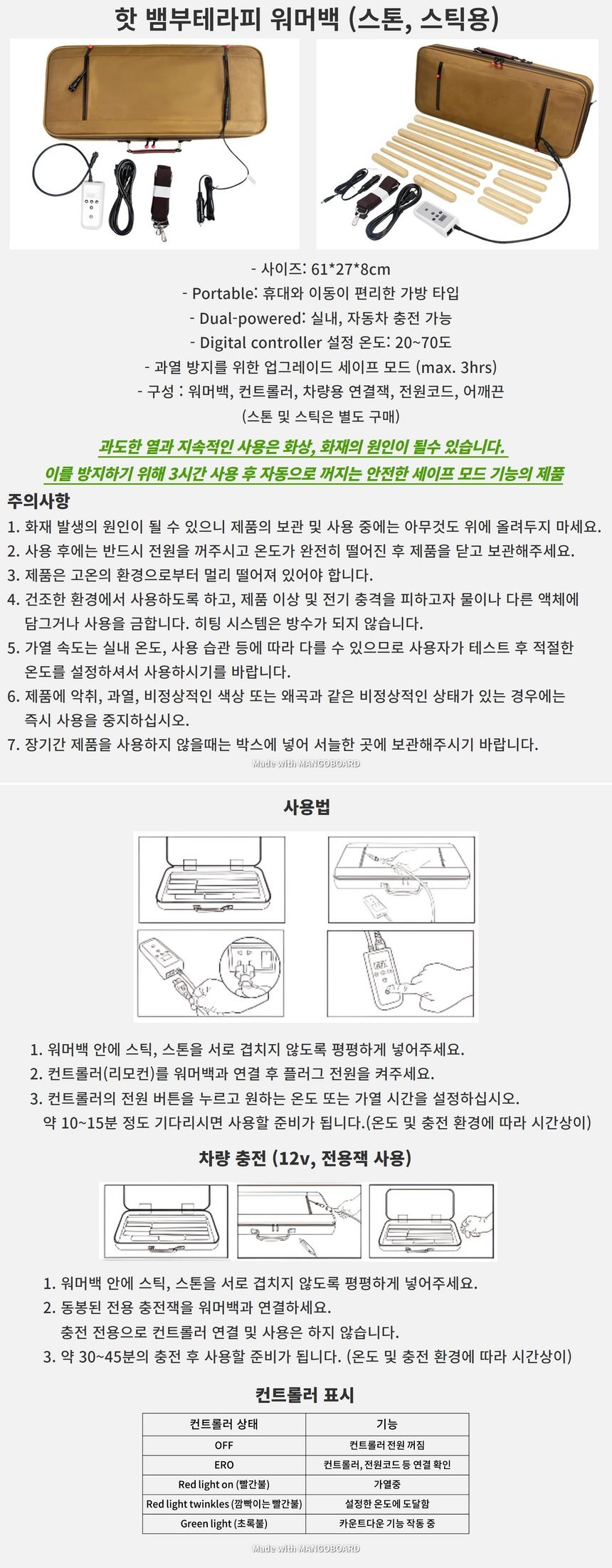 | 사용방법 | 참 대나무 스틱으로 대나무 마디가 없고 부드럽고 단단해요 고온에서 태워 압축시킨 단단하고 꽉찬 100% 뱀부입니다 바로 사용하셔도 되지만 차갑게 또는 핫뱀부스틱으로 따뜻하게 데워 쓰시면 순환에 훨씬 좋아요. |