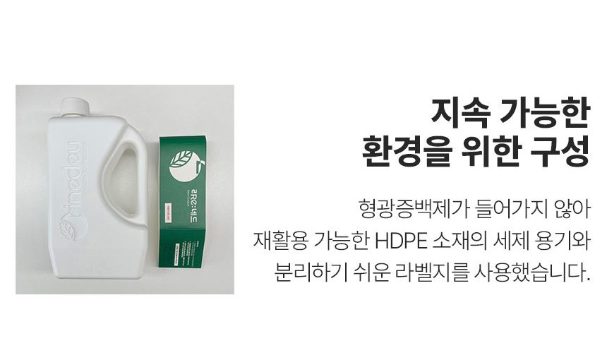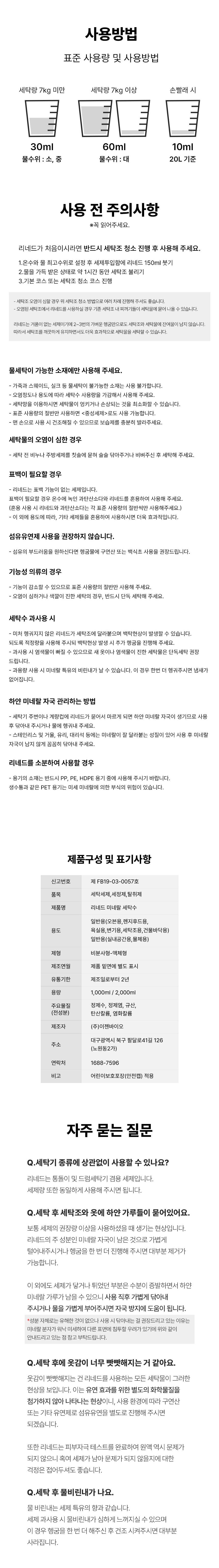 | 사용상 주의사항 | · 표준사용량을 준수해주시고, 사용방법과 주의사항을 준수하여 사용 하십시오 · 세탁 이외의 용도로 사용하지 마시고, 사용 후 밀폐하여 보관하십시오 · 어린이 손에 닿지 않는 곳에 보관하십시오. · 담금세탁을 하실 경우에는 의류보호를 위하여 담금시간은 30분 이내로 하십시오. · 세제가 직접 의류에 닿지 않도록 주의하시고, 물에 잘 풀어서 사용해 주십시오 · 다른 세제와 혼합하여 사용하는 것을 금합니다. · 사용 전 의류에 부착된 표기사항을 확인 후 세탁하십시오.(모, 견, 가죽 및 금속염료로 날염한의류에는 사용하지마십시오. · 각종 금속 등이 부착되어 있는 의류는 금속에 의한 의류 손상이 되지 않도록 조치한 후 세탁하여 주십시오.· 금속 성분이 많이 함유된 지하수, 녹물 등을 사용하면 의류 손상의 우려가 있 |