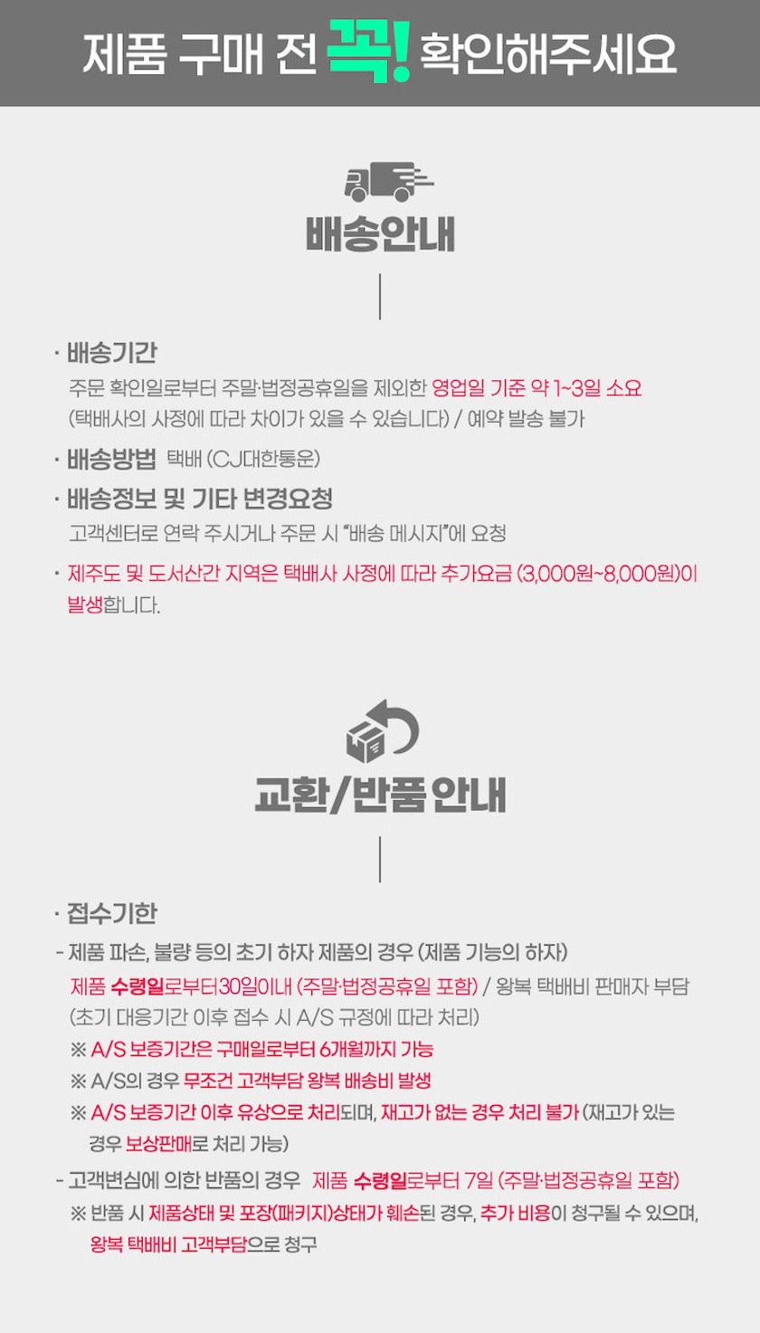 ㆍ 반품/교환 시 고객님 귀책사유로 인해 수거가 지연될 경우에는 반품이 제한될 수 있습니다.