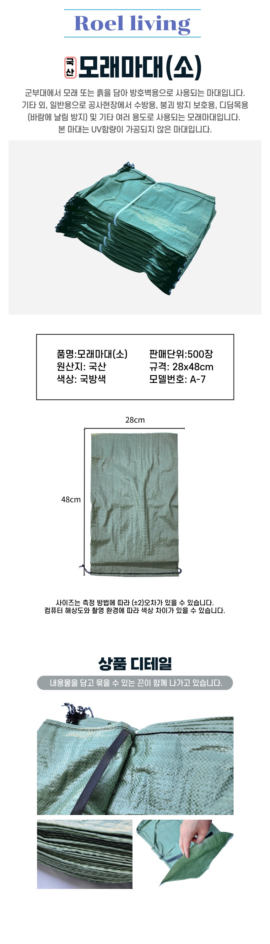 로엘리빙 국산 모래마대 소사이즈 28x48cm 500매 국방색 군부대 방호벽용 수방용 붕괴방지 / 로엘리빙 / 디비디비 / 구매하기 / 특가할인