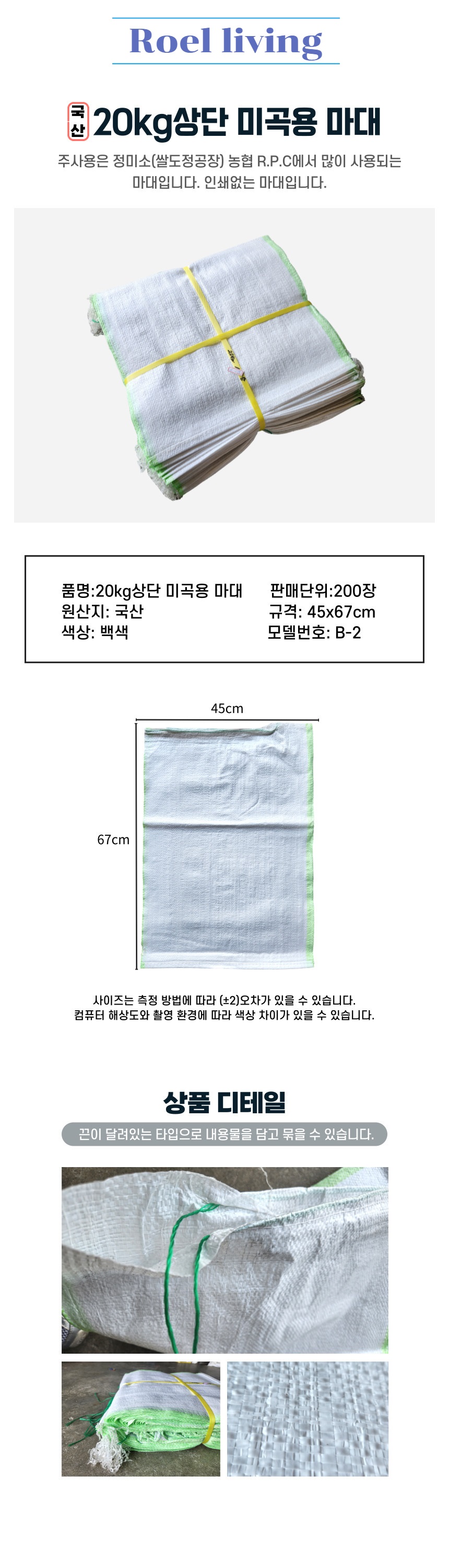 로엘리빙 국산 미곡용마대 20kg 45x67cm 100매 작업 산업 공업 농업용 쌀포대 / 로엘리빙 / 디비디비 / 구매하기 / 특가할인