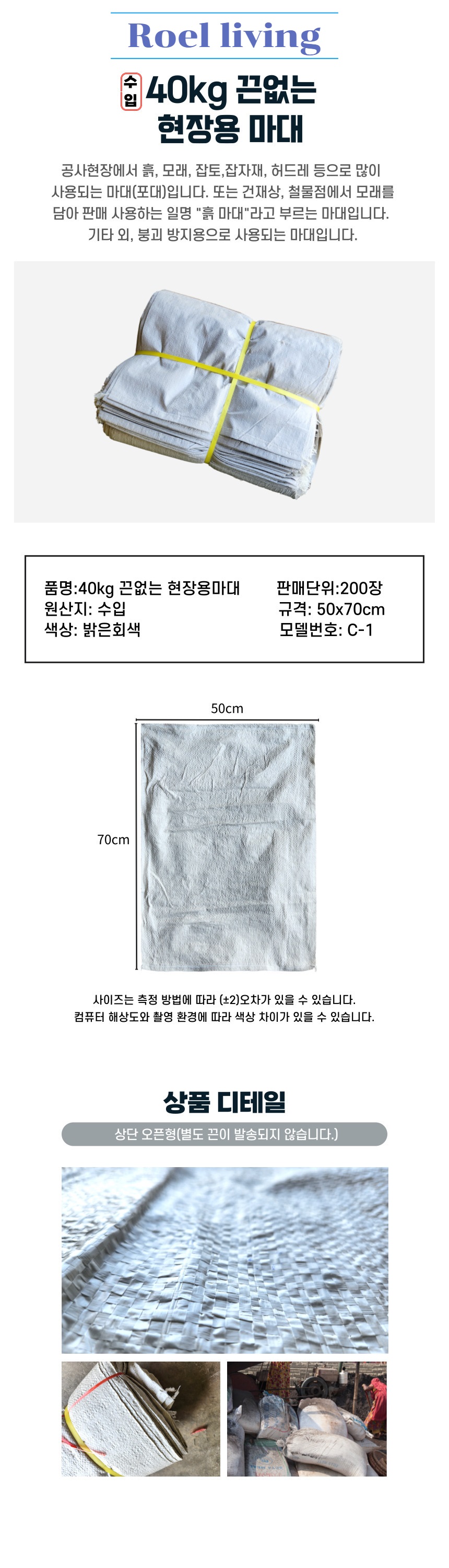 로엘리빙 수입 끈없는 현장용마대 40kg 50x70cm 200매 작업 산업 공업 농업용 마대