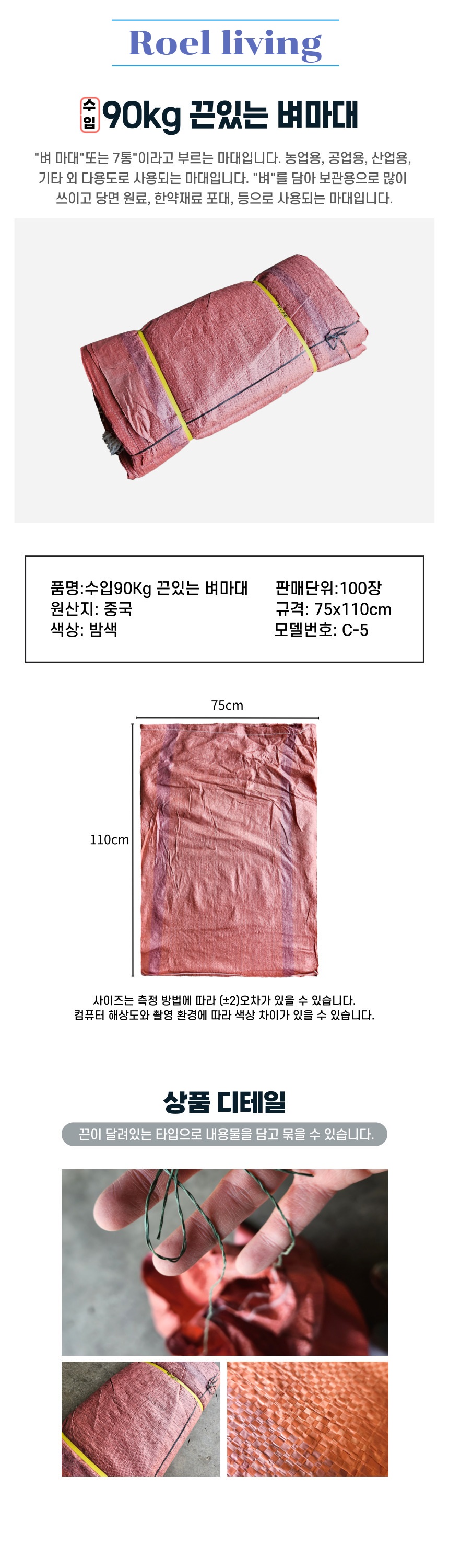 • 로엘리빙 수입 끈있는 벼마대 90kg 75x110cm 100매 작업 산업 공업 농업용 쌀포대