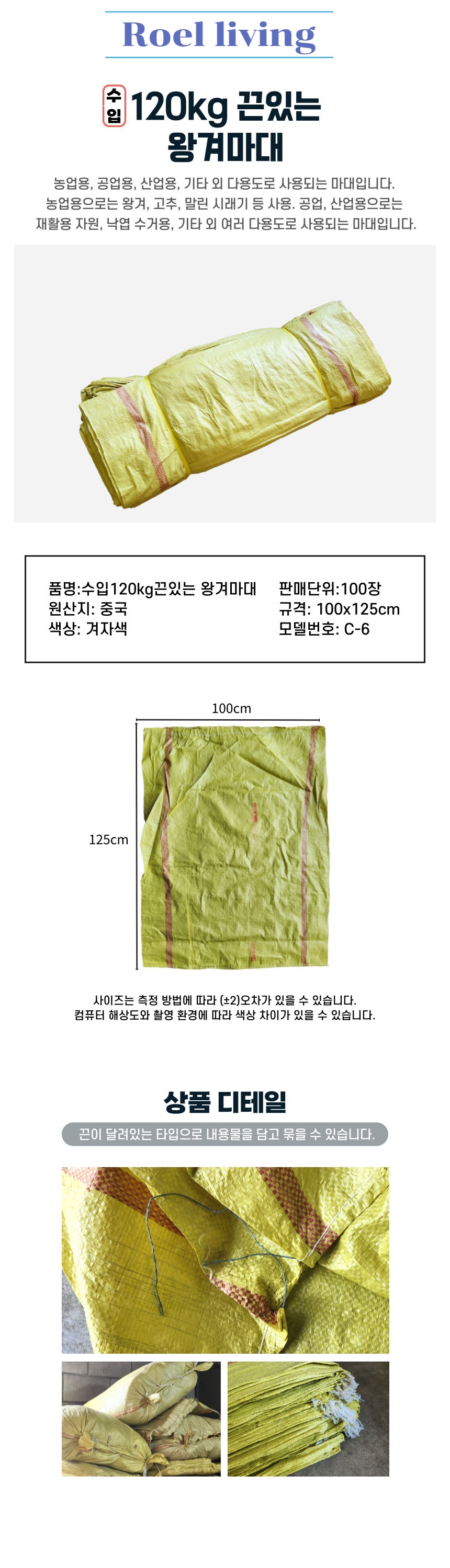 로엘리빙 수입 끈있는 왕겨마대 120kg 100x125cm 100매 작업 산업 공업 농업용 쌀포대 / 로엘리빙 / 디비디비 / 구매하기 / 특가할인