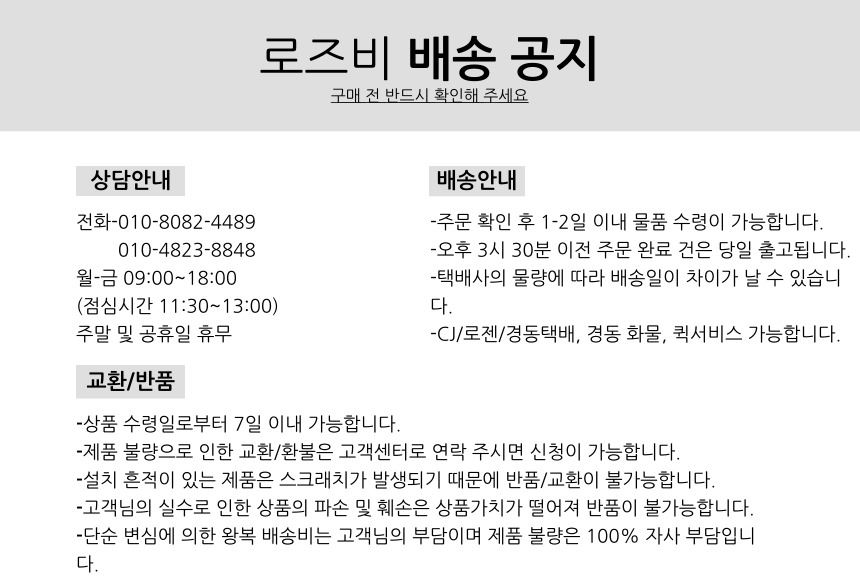 반품/교환안내 : 제품 개봉및 조립시 반품및 교환 불가하며, 반품 및 교환은 반드시 전화 통화 후 보내주셔야 합니다.