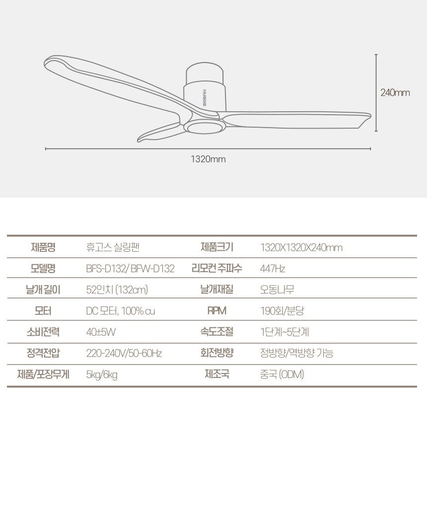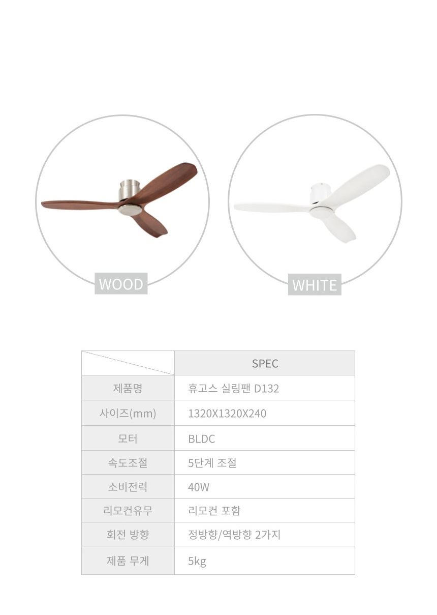 • 휴고스 실링팬 BFS-D132 타프팬 천장형선풍기 화이트 52인치(132cm) 정방향 역방향 BLDC모터 홈
