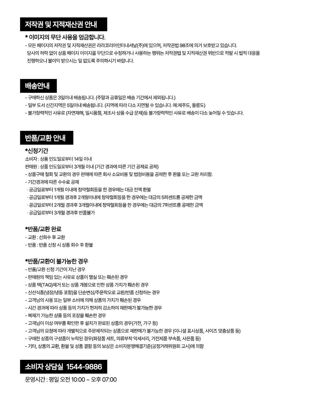 ㆍ 제품의 불량이 아닌 소비자의 귀책사유로 제품의 불량이 발생한 경우에는 환불, 교환을 받으실 수 없습니다.