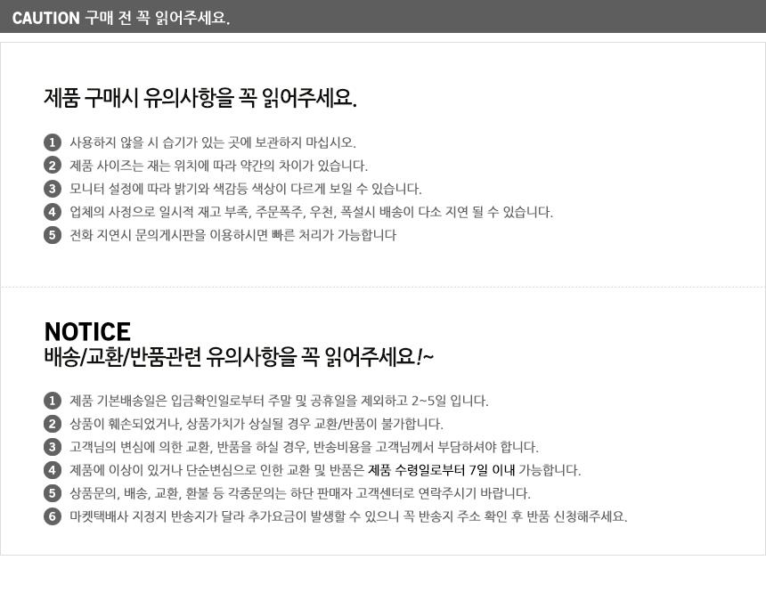 ㆍ 제품의 불량이 아닌 소비자의 귀책사유로 제품의 불량이 발생한 경우에는 환불, 교환을 받으실 수 없습니다.