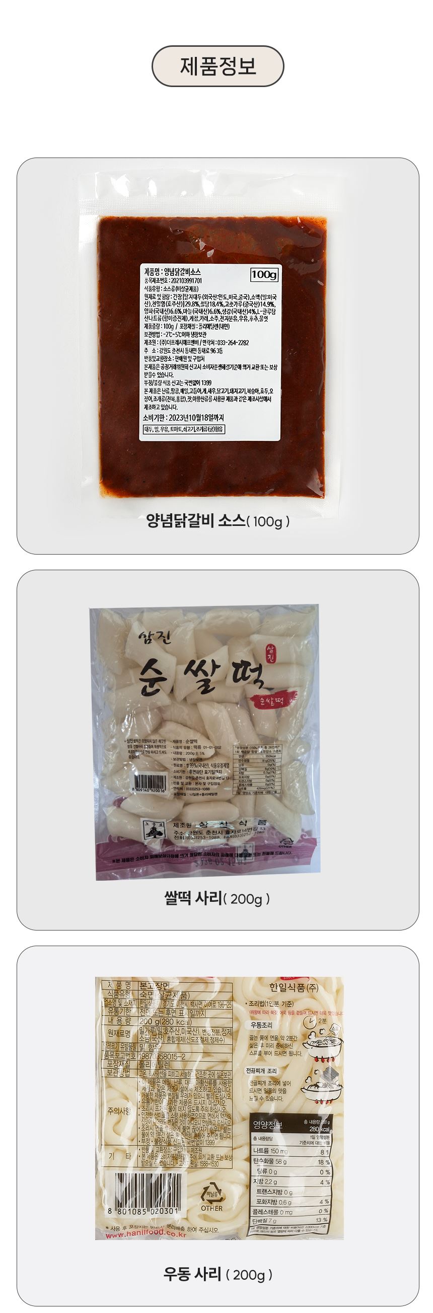 포장단위별 수량(ℓ, ㎖, g, kg) 2500g (닭갈비1kg 2팩 / 소스100g / 떡200g / 우동사리200g)