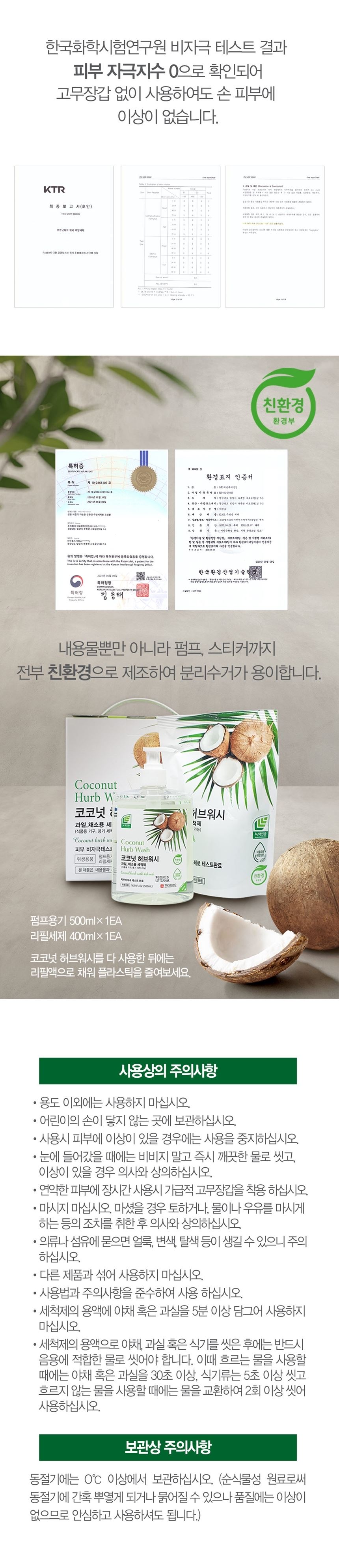 • 코코넛 허브워시 과일 채소용 주방세제세트(본품 500ml+리필 400ml)/식기 조리기구 세척/녹색 인증