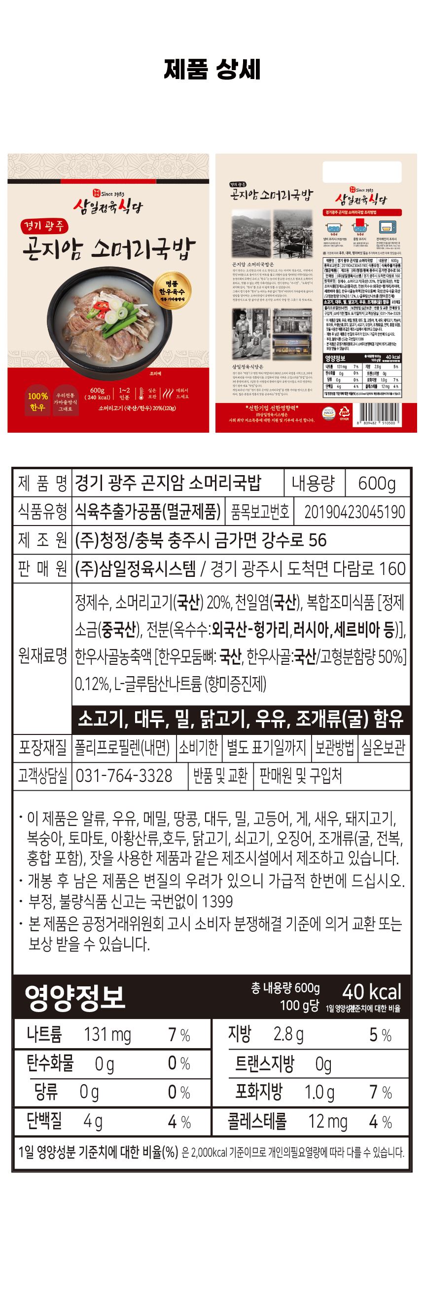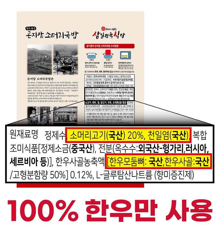 • 삼일정육식당 경기 광주 곤지암 한우 소머리국밥 600g 1팩