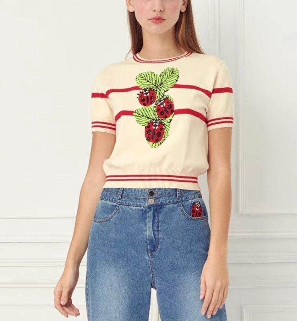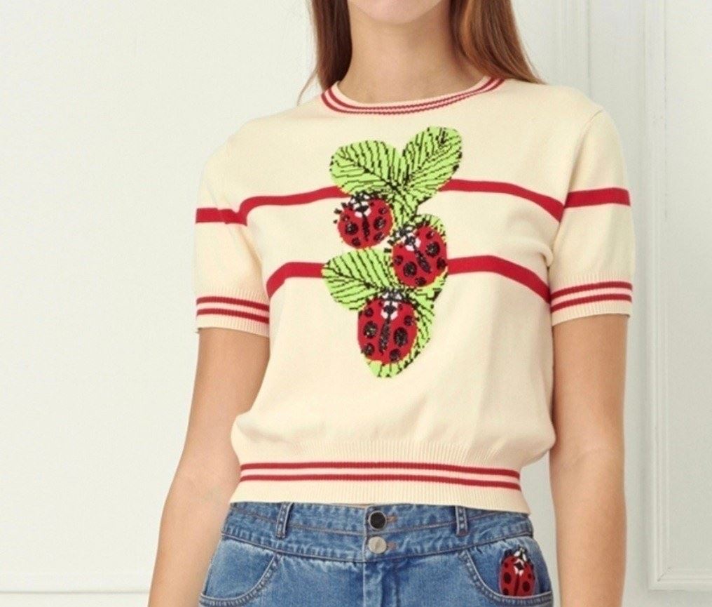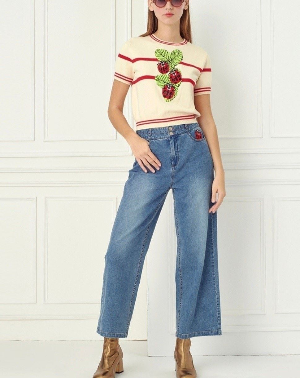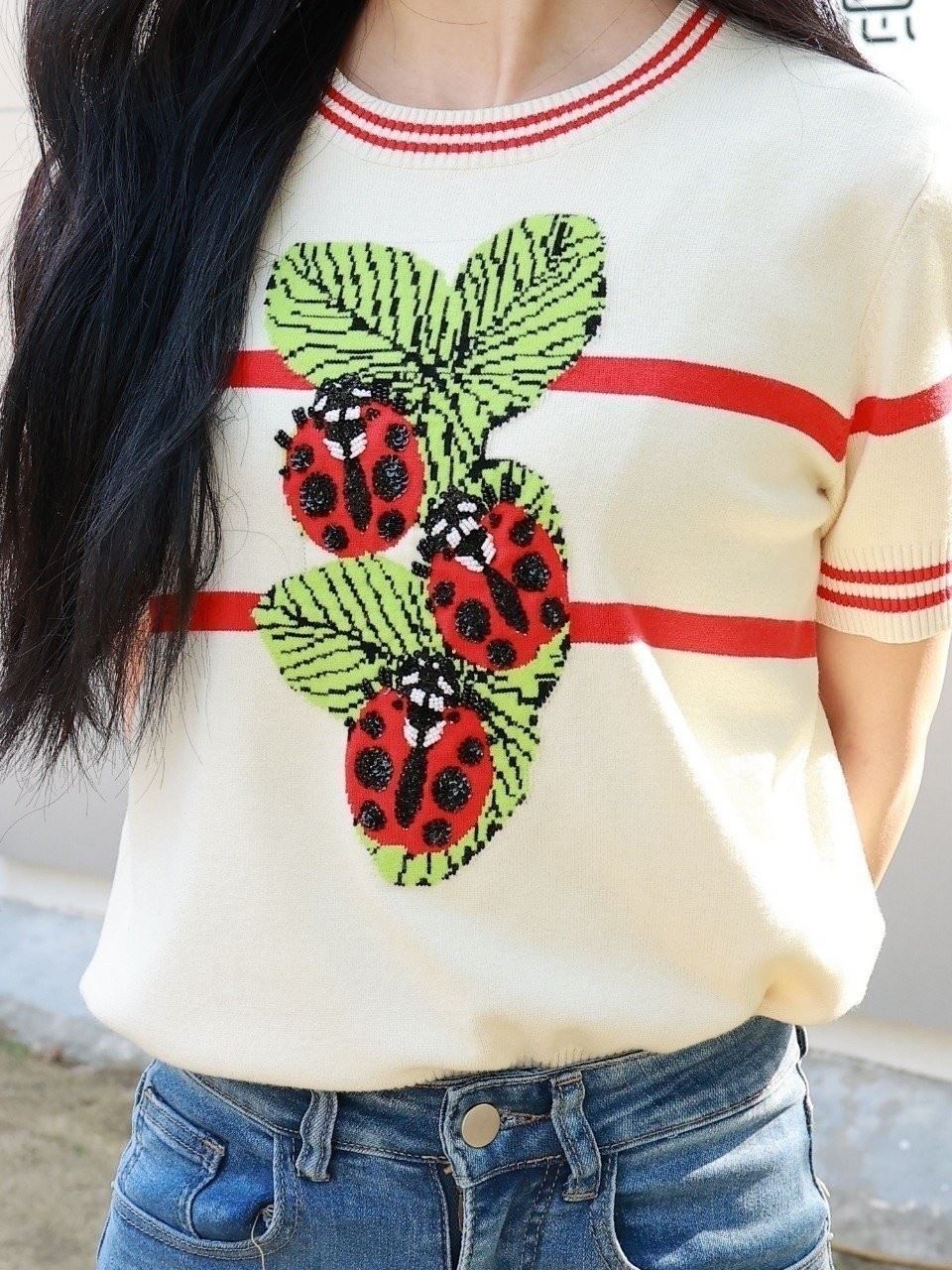 • 자수 슬팽글 무당벌레 여성 라운드넥 반팔니트