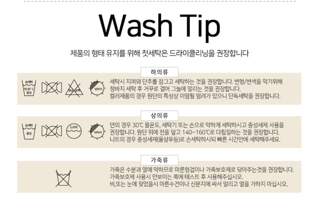 세탁방법 및 취급 시 주의사항 상품상세참조