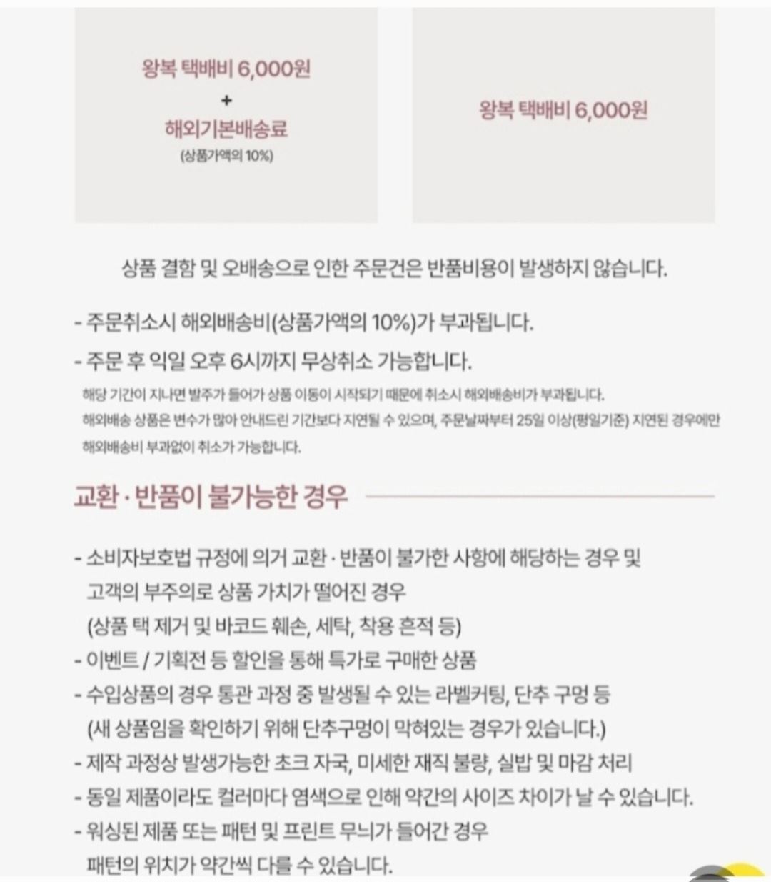 ㆍ 판매자가 반품상품 확인 후 상품불량이 아닌 것으로 판명 시 반송비(또는 왕복배송비)를 고객님께 부과할 수 있습니다.